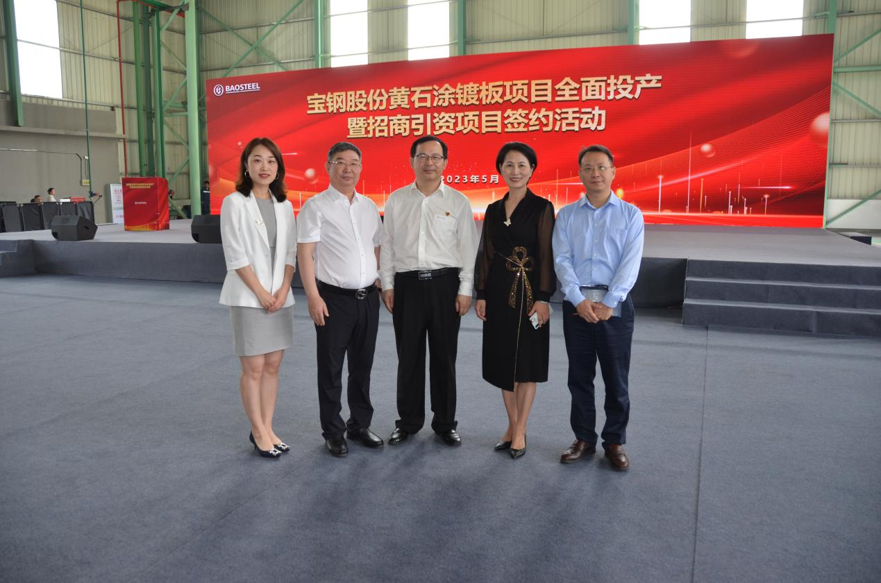 董事長劉國民和寶鋼股份黃石涂鍍板有限公司總經(jīng)理助理兼制造部部長劉浩洲(左三)